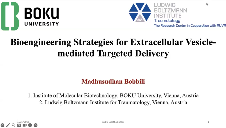 In this month's edition of the ASEV jour fixe, Madhusudhan Bobbili, postdoc at BOKU University and LBI Trauma, Vienna, presented the frontiers of "Bioengineering Strategies for Extracellular Vesicle-mediated Targeted Delivery".